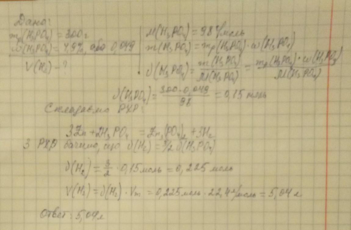 Обчисліть об’єм водню, що утвориться при взаємодії цинку розчином ортофосфатної кислоти масою 300 г з масовою часткою кислоти 4,9 % .