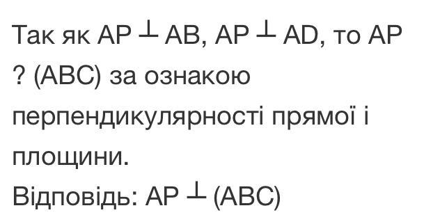 Пряма АР проходить через вершину А паралелограма АВСD, АР перпендикулярна АВ, АР перпендикулярна АD. Як розміщена пряма АР відносго площини паралелограма ABCD