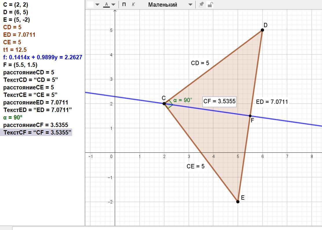 F = (D (6; 5) + E (5; -2)) / 2 = (5,5; 1,5).