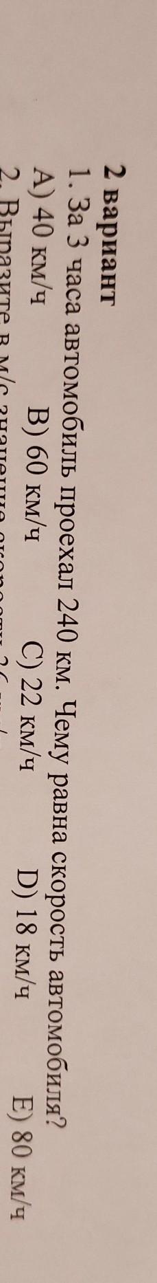 2 вариант 1. За 3 часа автомобиль проехал 240 км. Чему равна скорость автомобиля? A) 40 км/ч В) 60 км/ч C) 22 км/ч D) 18 км/ч E) 80 км/ч ПОМГИТЕ ЭТО СОЧ ПЖ ....