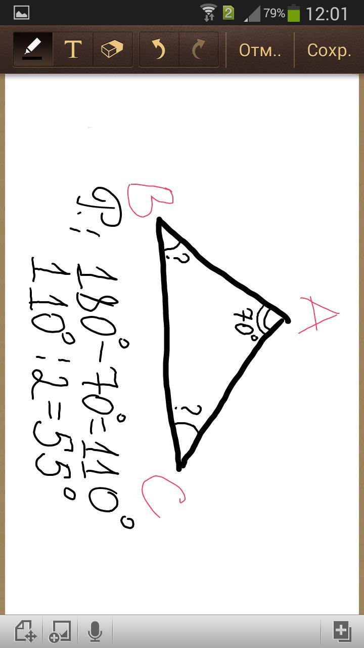 то чтобы найти углы при основании нужно из 180° вычесть угол при вершине то есть 70° и результат разделить на 2.