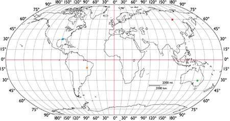 Определите географические координаты красной точки на карте мира