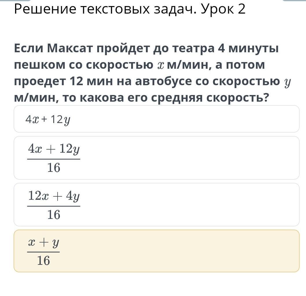 если Максат пройдет до театра 4 минуты пешком со скоростью x м/минута а потом проедит 12 минут на автобусе со скорости y м/минуту то какова его средняя скорость?