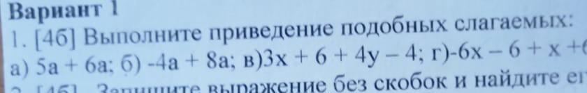 1.Выполните приведение подобных слагаемых: a) 5a + 6a; 6)-4a + 8a; B)3x + 6 + 4y - 4; r)-6x-6+x+6
