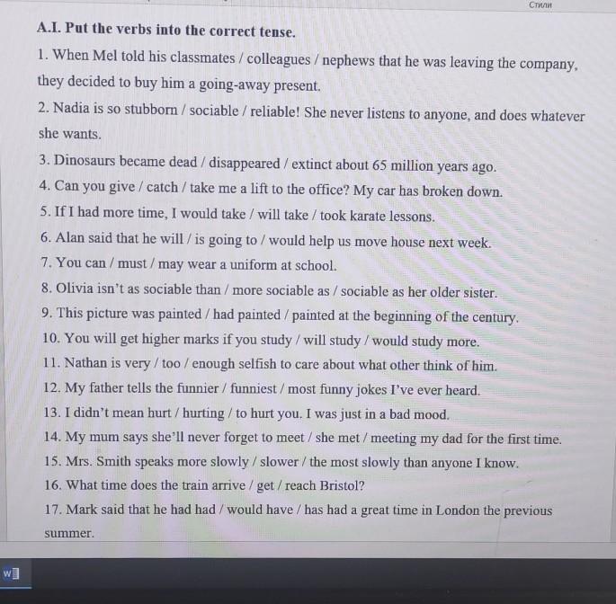 Put the verbs into the correct tense. 1. When Mel told his classmates / colleagues / nephews that he was leaving the company, they decided to buy him a going-away present. 2. Nadia is so stubborn / sociable/reliable! She never listens to anyone, and does whatever she wants. 3. Dinosaurs became dead / disappeared / extinct about 65 million years ago. 4. Can you give / catch / take me a lift to the office? My car has broken down. 5. If I had more time, I would take / will take / took karate lessons. 6. Alan said that he will / is going to / would help us move house next week. 7. You can/must / may wear a uniform at school. 8. Olivia isn't as sociable than / more sociable as / sociable as her older sister. 9. This picture was painted / had painted / painted at the beginning of the century. 10. You will get higher marks if you study / will study / would study more. 11. Nathan is very / too / enough selfish to care about what other think of him. 12. My father tells the funnier / funniest/most funny jokes I've ever heard. 13. I didn't mean hurt/hurting / to hurt you. I was just in a bad mood. 14. My mum says she'll never forget to meet / she met / meeting my dad for the first time. 15. Mrs. Smith speaks more slowly / slower / the most slowly than anyone I know. 16. What time does the train arrive / get / reach Bristol? 17. Mark said that he had had / would have / has had a great time in London the previous summer.