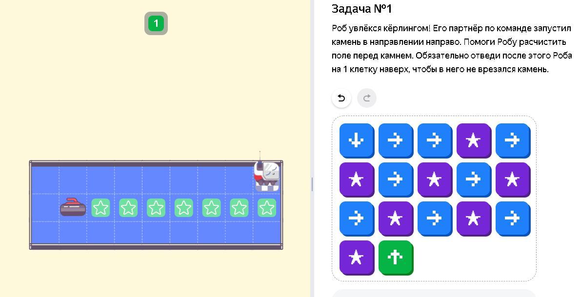 Роб увлёкся кёрлингом! Его партнёр по команде запустил камень в направлении направо. Помоги Робу расчистить поле перед камнем. Обязательно отведи после этого Роба на 1 клетку наверх, чтобы в него не врезался камень.