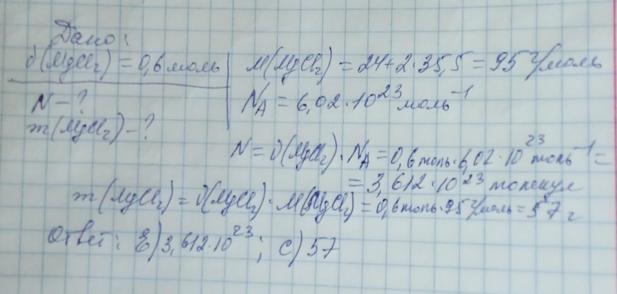 число молекул и масса 0.6 моль хлорида магния(MgCI2)