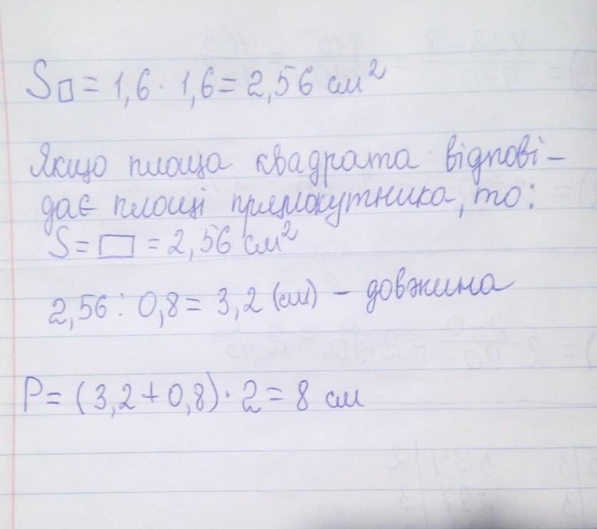 Квадрат зі стороною 1,6 см і прямокутник, ширина якого 0,8 см, мають рівні площі. Знайди периметр прямокутника.
