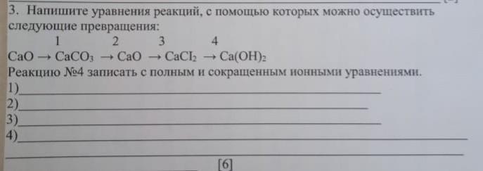 3. Напишите уравнения реакций, с помощью которых можно осуществить следующие превращения: CaO - CaCO3 - CaO - CaCl2 - Ca(OH)2 Реакцию №4 записать с полным и сокращенным ионными уравнениями.
