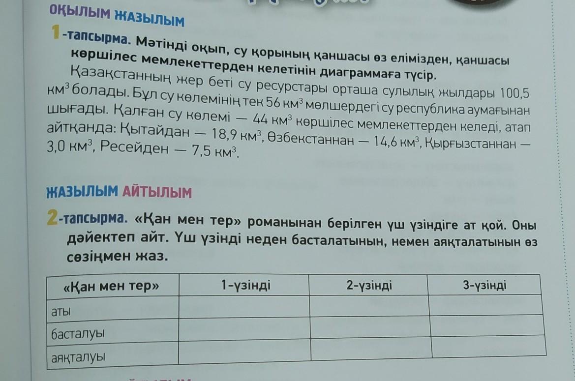 1-тапсырма. Мәтінді оқып, су қорының қаншасы өз елімізден, қаншасы көршілес мемлекеттерден келетінін диаграммаға түсір. Қазақстанның жер беті су ресурстары орташа сулылық жылдары 100,5 км3 болады. Бұл су көлемінің тек 56 км2 мөлшердегі су республика аумағынан шығады. Қалған су көлемі — 44 км3 көршілес мемлекеттерден келеді, атап айтқанда: Қытайдан — 18,9 км2, Өзбекстаннан 14,6 км”, Қырғызстаннан 3,0 км2, Ресейден – 7,5 км2.