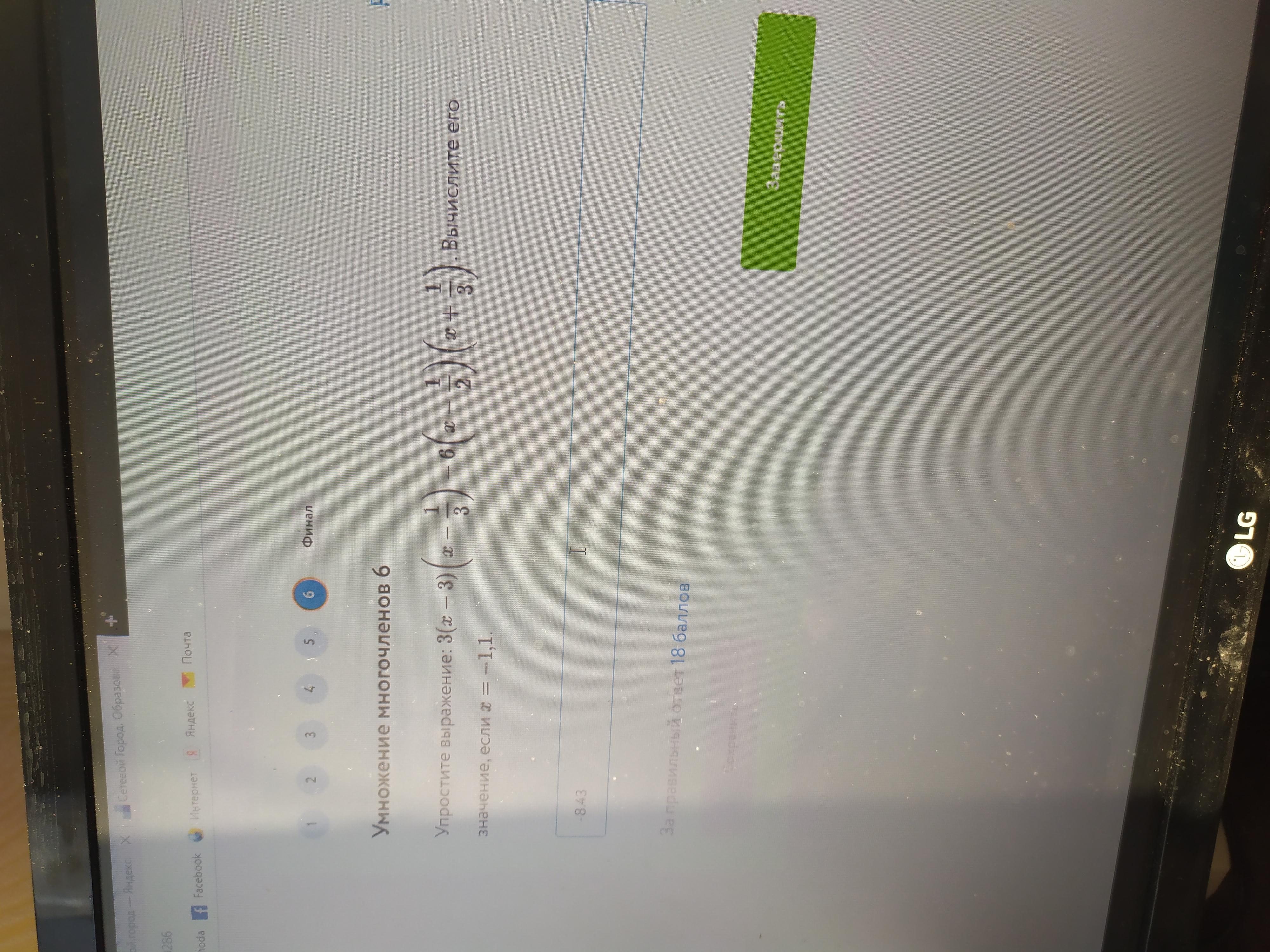 3( {x}^{2}  -  \frac{x}{3}  - 3 x + 1) - 6( {x}^{2}   +   \frac{x}{3}  -  \frac{x}{2}  -  \frac{1}{6} ) = 3 {x}^{2}  - x - 9x + 3 - 6 {x}^{2}   -  2x  + 3x + 1 =  - 3 {x}^{2}  - 9x + 4 \\ 3 \times  ({ - 1.1}^{2} ) - 9 \times ( - 1.1) + 4 = - 3.63 + 9.9 + 4 = 10.27