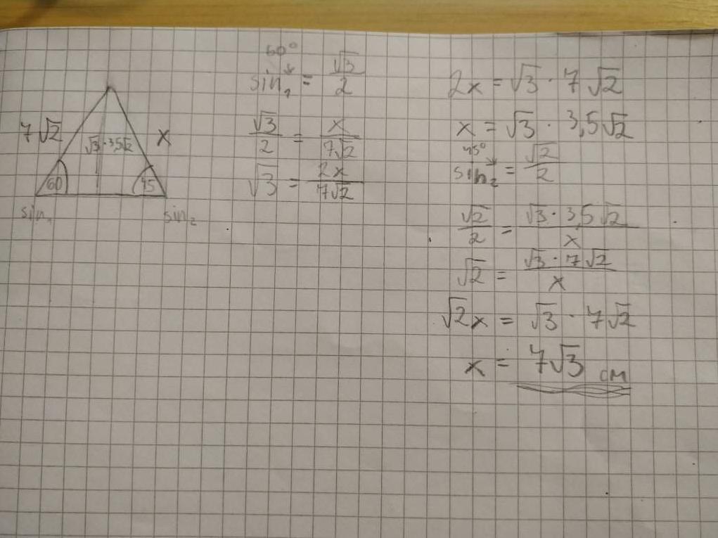 В треугольнике два угла равны 60 и 45 градусов, а сторона, лежащая против меньшего из них, равна 7 корней из 2-ух см. Найди сторону, лежащую против большего из данных углов.
