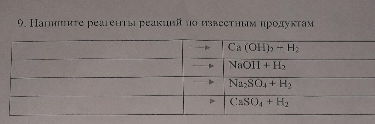 9. Напишите реагенты реакций по известным продуктам Ca(OH)2 + H2 NaOH + H2 Na2SO4 + H2 CaSO4 + H,