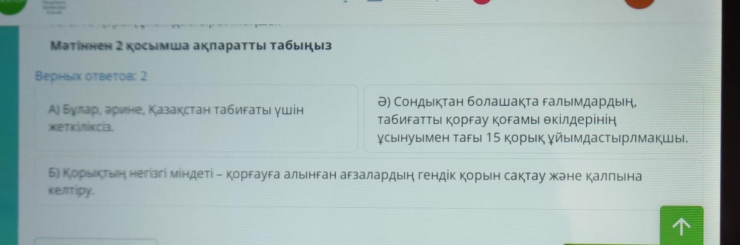 Верных ответов: 2 А) Бұлар, әрине, Қазақстан табиғаты үшін жеткіліксіз, Ә) Сондықтан болашақта ғалымдардың, табиғатты қорғау қоғамы өкілдерінің ұсынуымен тағы 15 қорық ұйымдастырлмақшы. Б) Қорықтың негізгі міндеті – қорғауға алынған ағзалардың гендік қорын сақтау және қалпына келтіру.