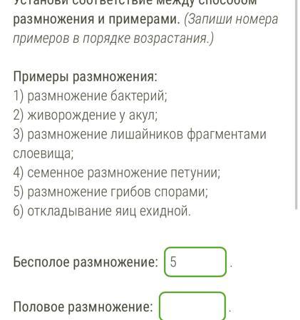 Установи соответствие между способом размножения и примерами. (Запиши номера примеров в порядке возрастания.)