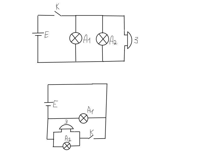 изобразите схему цепи состоящую из двух ламп звонка ключа .Источником тока является один гальванический элемент