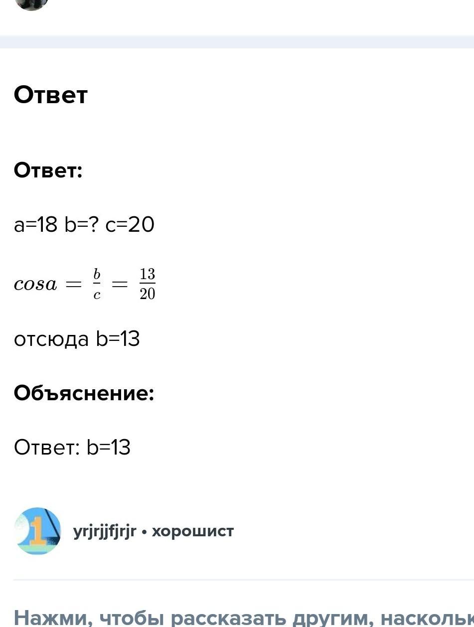 Найди неизвестную сторону треугольника, если две его стороны равны 18 и 20, а косинус угла между ними 13/20