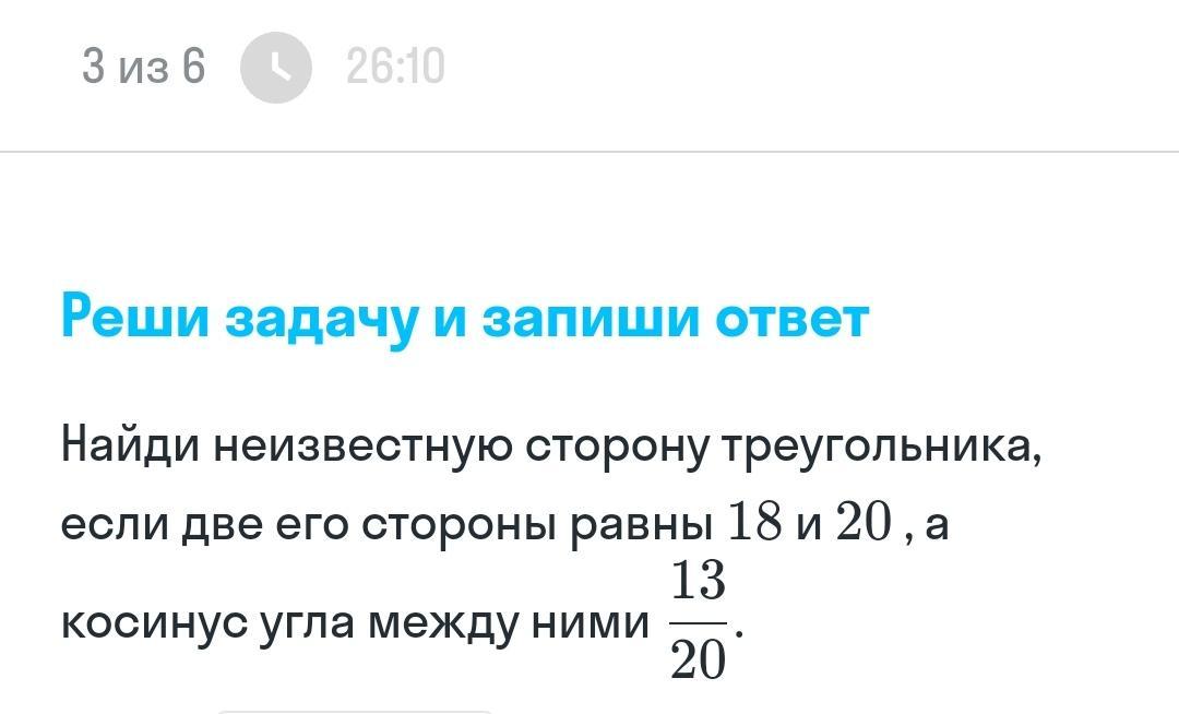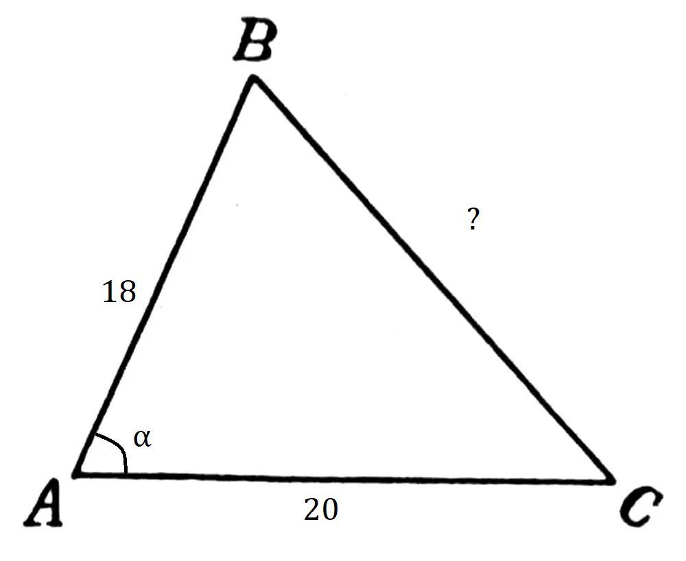 BC = √(AB² + AC² - 2 · AB · AC · cos α) = √(18² + 20² - 2 · 18 · 20 · 13/20) = √(724 - 468) = √256 = 16