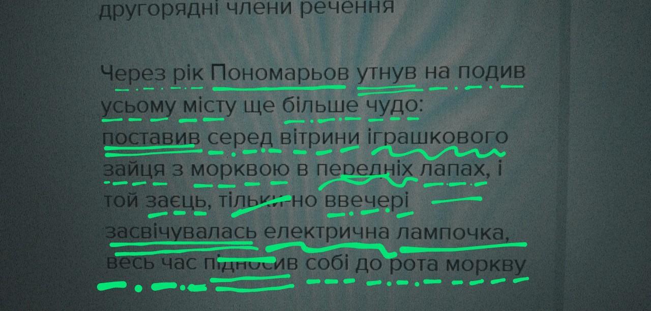 Через рік Пономарьов утнув на подив усьому місту ще більше чудо: поставив серед вітрини іграшкового зайця з морквою в передніх лапах, і той заєць, тільки-но ввечері засвічувалась електрична лампочка, весь час підносив собі до рота моркву
