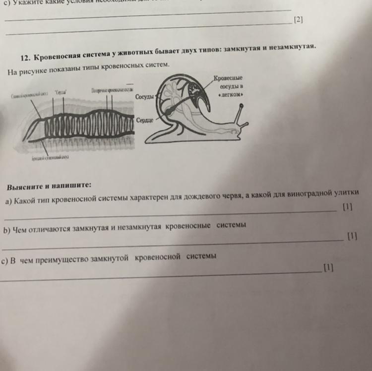а) замкнутая кровеносная система у червя, назамкнутая у улитки