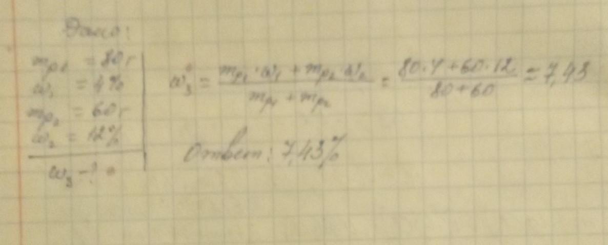 Смешали 80 грамм 4%-ного раствора соли и 60 грамм 12%-ного раствора этой же соли. Найти массовую долю соли в полученном растворе. (в ответе запишите число, с точностью до сотых, БЕЗ знака %)