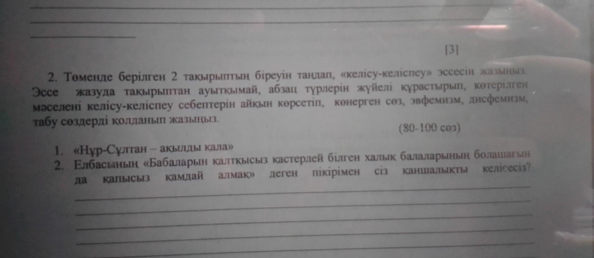 131 2. Төменде берілген 2 тақырыптың біреуін таңдап, «келісу-келіспеу» эссесін жазыңыз. Эссе жазуда тақырыптан ауытқымай, абзац түрлерін жүйелі құрастырып, көтерілген мәселені келісу-келіспеу себептерін айқын көрсетіп, көнерген сөз, эвфемизм, дисфемизм, табу сөздерді қолданып жазыңыз. (80-100 cos) 1. «Нұр-Сұлтан - ақылды қала» 2. Елбасының «Бабаларын қалтқысыз қастерлей білген халық балаларының болашағын да қапысыз қамдай алмақ» деген пікірімен сіз қаншалықты келісесіз?