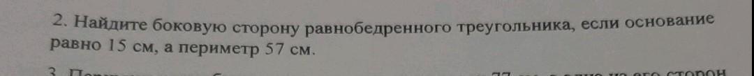 (57-15):2=21 см так как у равнобедренного треугольника боковые стороны равны