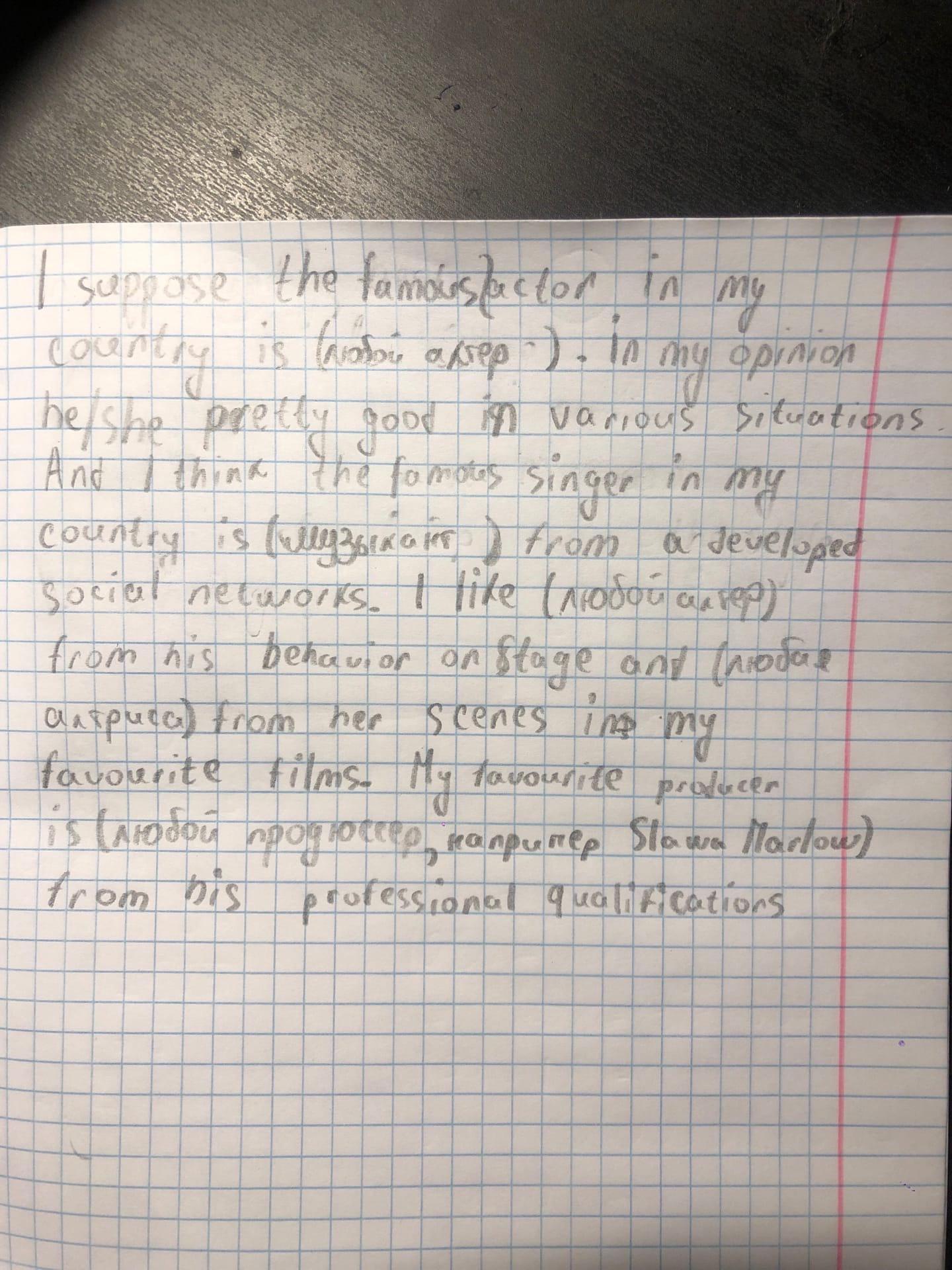 Card 5. Prepare an individual talk on the topic 'Drama and Comedy'. The following questions will help you to organize your talk: 1) Who are the famous actors and musicians in your country? Why do you think so? 2) Who are your favourite actors and actresses? 3) Why do you think so? 4) Who is your favourite producer? 5) Why do people like watching comedies?