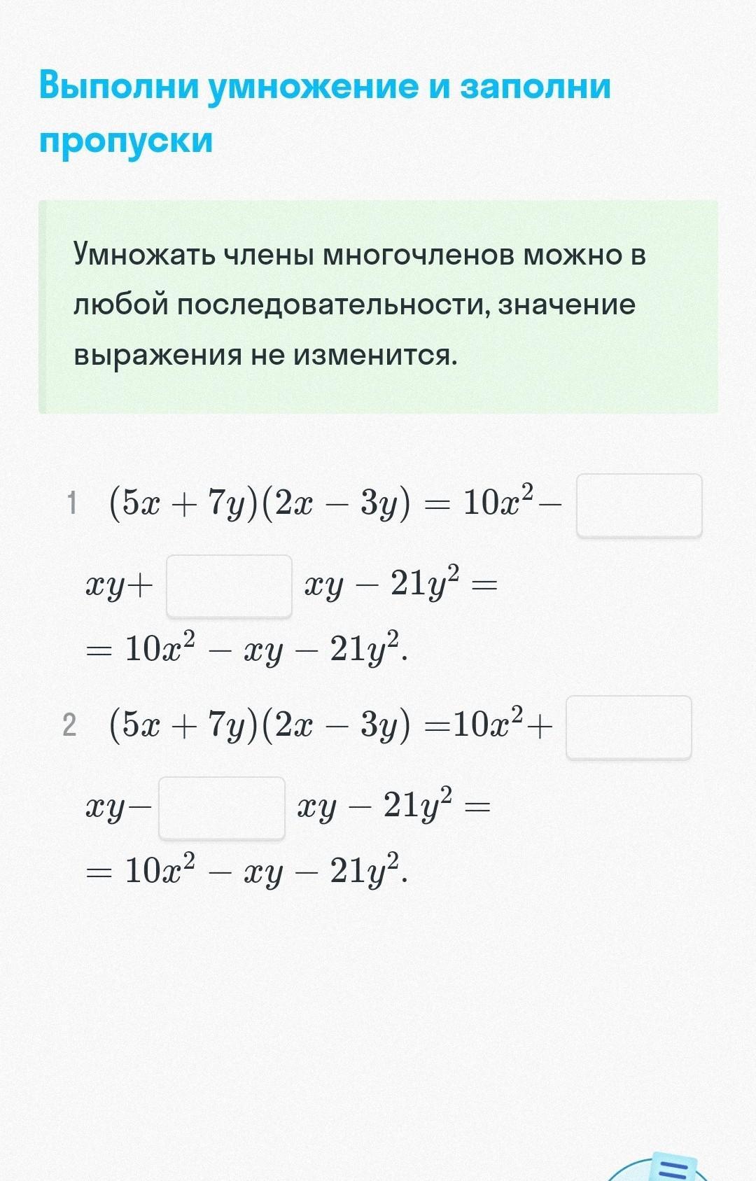 1. (5х+7у)*(2х-3у)=10х²-15ху+14ху-21у²=10х²-ху-21у²