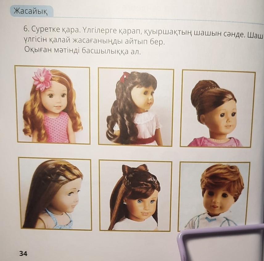 Жасайық 6. Суретке қара. Үлгілерге қарап, қуыршақтың шашын сәнде. Шаш үлгісін қалай жасағаныңды айтып бер. Оқыған мәтінді басшылыққа ал. ПОЖАЛУЙСТА ПОМОГИТЕ