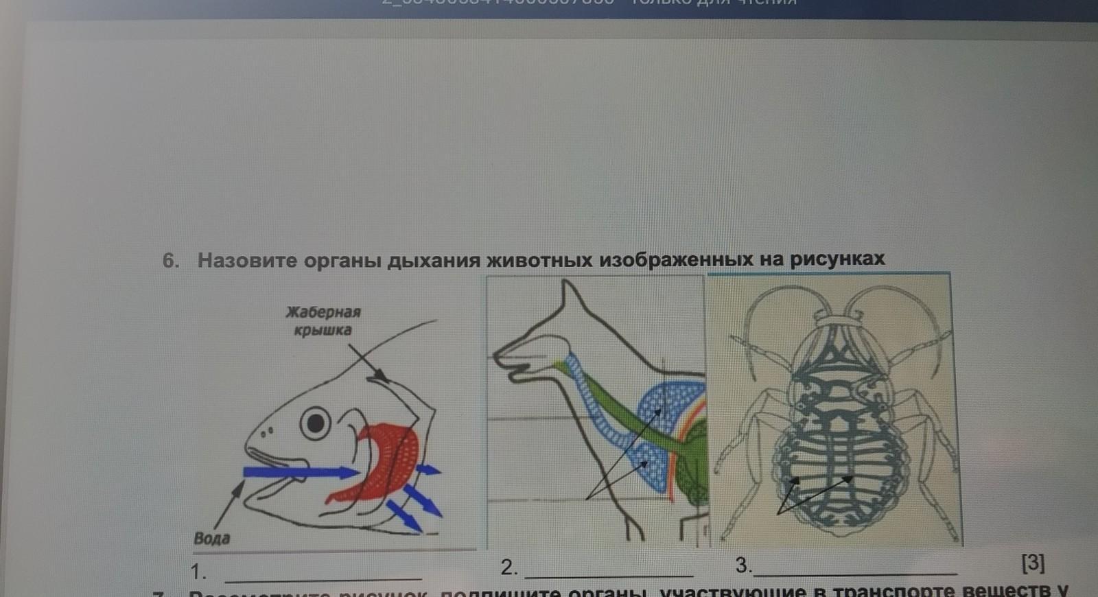 6. Назовите органы дыхания животных изображенных на рисунках жаберная крышка Вода 1. 2. 3. п