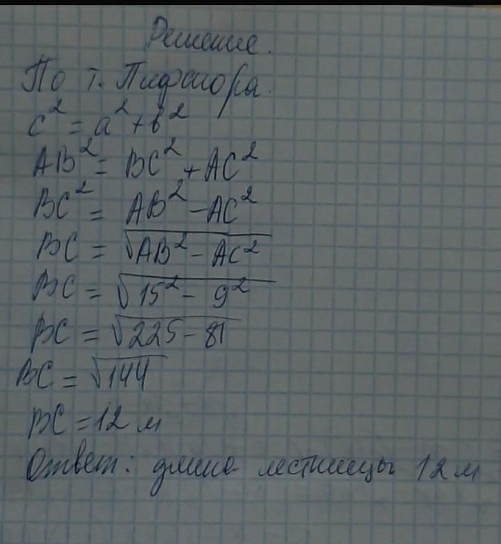 лестница длиной 15 м приставлена к вертикальной стене так что Нижний её конец отстоит от стены на 9 м На какой высоте находится другой конец лестницы