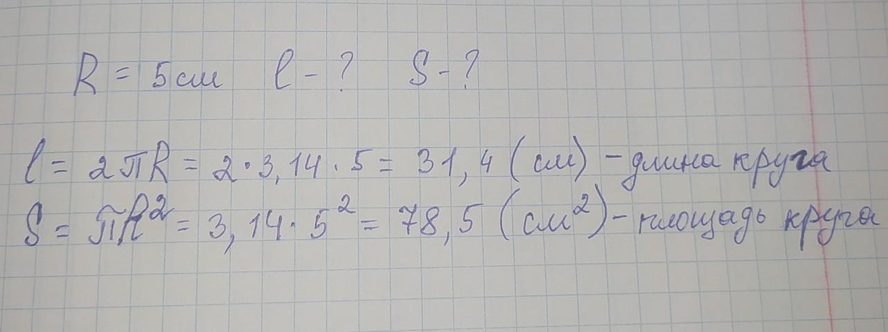 Длину окружности обретаем по формуле: С=2 r C=2*3,14*5=31,4см. Площадь круга обретаем по формуле: S= R S=3,145=78,5см.