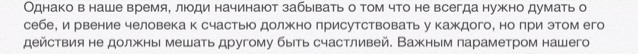Однако в наше время, люди начинают забывать о том, что не всегда нужно думать о себе, и рвение человека к счастью должно присутствовать у каждого, но при этом его действия не должны мешать другому быть счастливей.