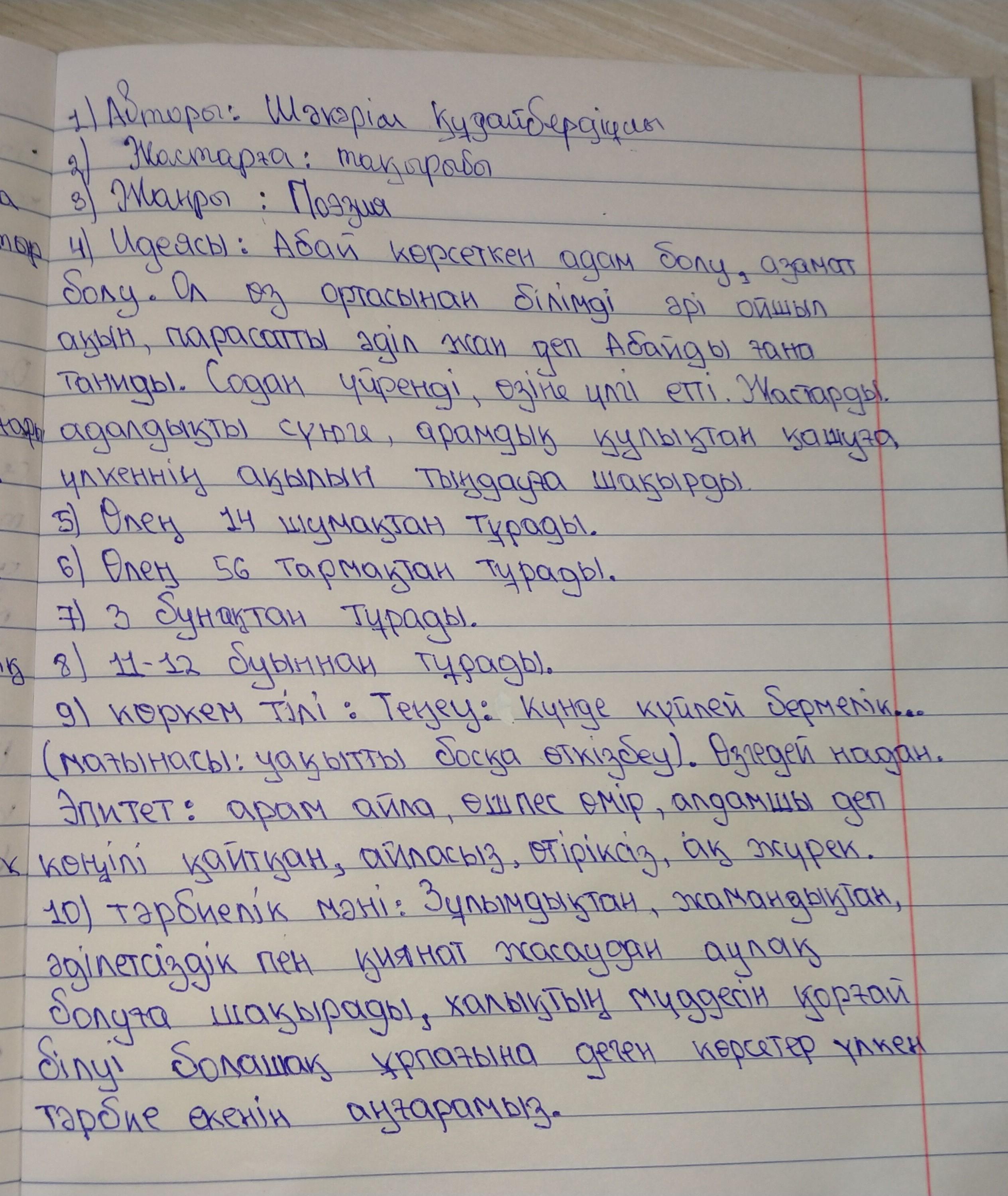 • Өлеңнің, құрылысына төмендегі ретпен талдау жасаңдар: 1) жанр түрі; 2) шумақ; 3) тармақ; 4) бунақ; 5) буын саны; 6) ұйқас түрі. • Өлеңдегі жастардың бойында болу керек ізгі қасиеттерді өсу ретімен, арылу керек жаман әдеттерді кему ретімен үлгіні пайдаланып жазыңдар. Өсу реті Кему ретімен үлгіні пайдаланып жаз.