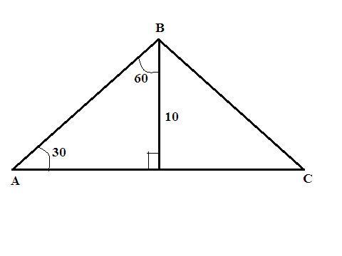 Высота, проведенная к основанию, делит равнобедренный треугольник на два прямоугольных треугольника с катетами - 10 и половина основания (АС/2) и гипотенузами - боковые стороны. Углы образовавшихся треугольников - 90°, 60° (высота она же биссектриса), 30° (90-60=30). Катет против угла 30° равен половине гипотенузы. Гипотенуза - 10*2=20 ед. По т. Пифагора второй катет - √(20²-10²)=10√3 ед. Тогда основание АС=2*10√3=20√3.