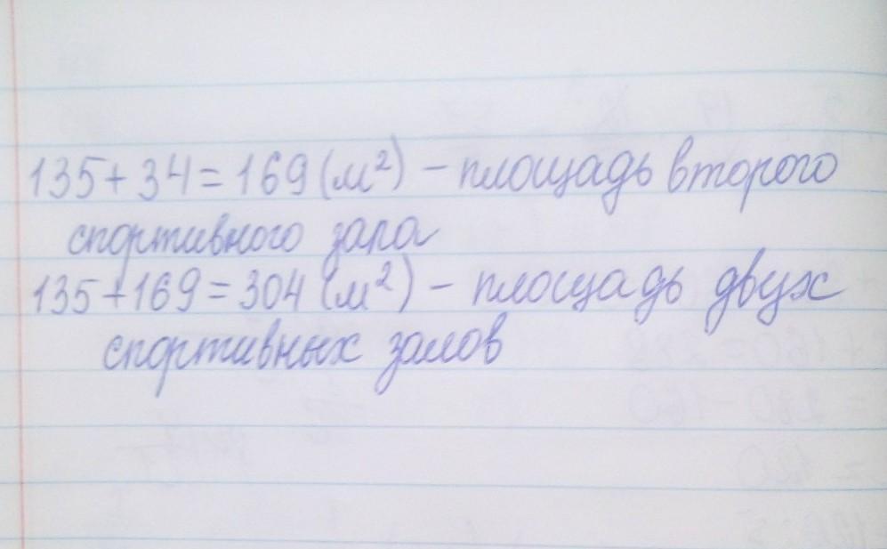 Площадь одного спортивного зала 135 м^2м . Это на 34 м^2м меньше, чем площадь другого спортивного зала. Какая общая площадь двух залов?