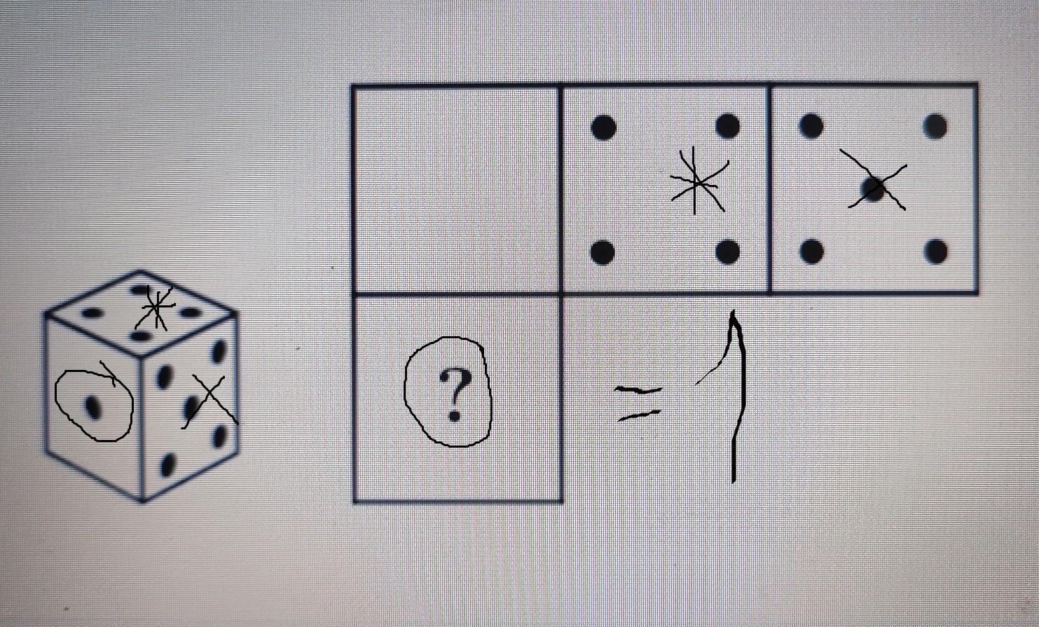 ответ будет 3, так как в условии сказано, что на противоположных гранях сумма =7, т.е. 2+5=7, 6+1=7, 4+3=7 кубик лежит на стороне с числом 3, поэтому и в клетке с ? будет цифра 3