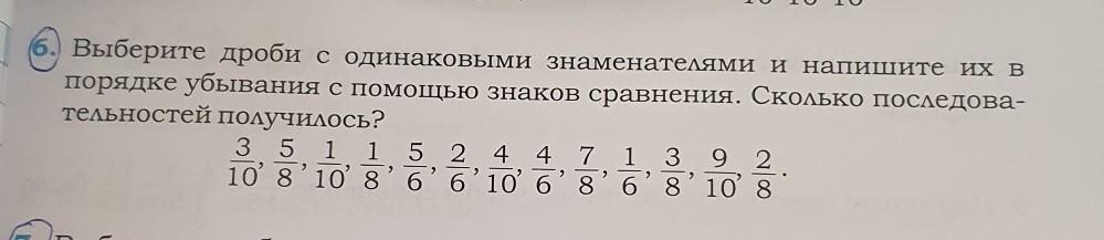 Выберите дроби с одинаковыми знаменателями и напишите их в порядке убывания с помощью знаков сравнения. Сколько последова- тельностей получилось? 3\10 5/8 1/10 1/8 5/6 2/6 4/10 4/6 7/8 1/6 3/8 9/10 2/8