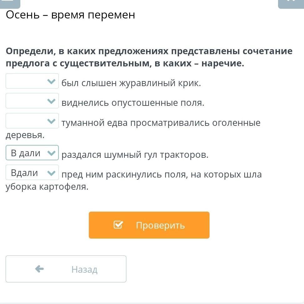 Осень - время перемен ИНТЕРАКТИВНЫЙ УРОК Определи, в каких предложениях представлены сочетание предлога с существительным, в каких-наречие. был слышен журавлиный крик. виднелись опустошенные поля. туманной едва просматривались оголенные Twig деревья. В дали раздался шумный ГУЛ тракторов. Вдали пред ним раскинулись поля, на которых шла уборка картофеля.