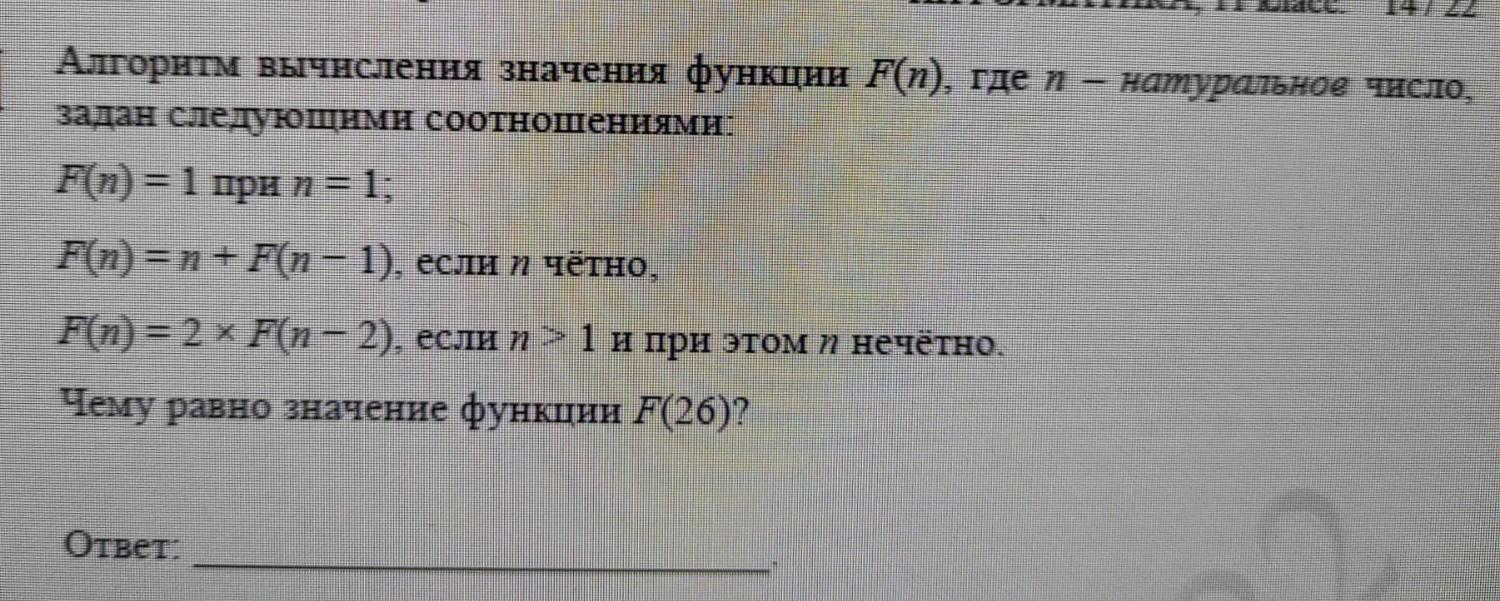 Алгоритм вычисления значения функции F(n), где и - натуральное число. задан следующими соотношениями: