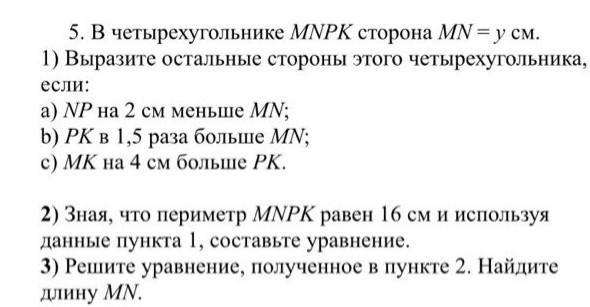 5. В четырехугольнике MNPK сторона WN = ycM 1) Выразите остальные стороны этого четырехугольника, 3) Решите уравнение, полученное в пункте 2. Найдите длину MN. 2) Зная, что периметр MNPK равен 16 см и используя данные пункта 1, составьте уравнение. b) РК в 1,5 раза больше MN; a) NP на 2 см меньше MN; c) МК на 4 см больше РК. если:
