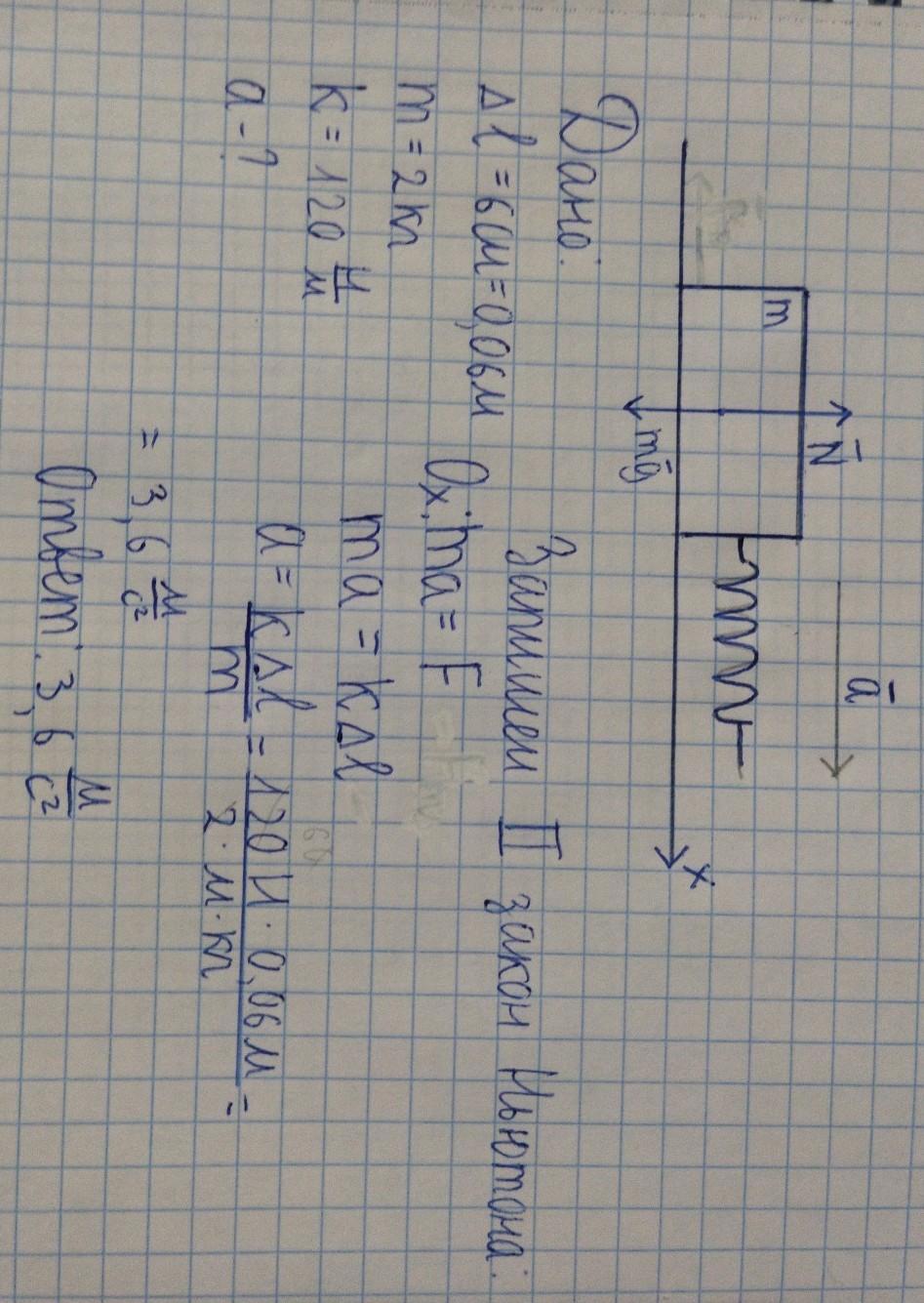 Груз массой 2 кг тянут по гладкой горизонтальной поверхности с помощью пружины, которая растянулась на 6 см. С каким ускорением движется груз, если коэффициент жесткости пружины равен 120 Н/м?