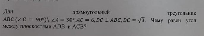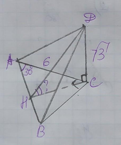 Проведём два перпендикуляра ДН и СН к стороне АВ. ∠ДНС между этими прямыми – это угол между плоскостями, который нужно будет найти. СН делит ∆АВС на 2 прямоугольных треугольника АСН и СВН. Рассмотрим ∆АСН. У него АН и СН – катеты, а АС – гипотенуза. Из ∆АСН найдём СН через синус угла. Синус угла – это отношение противолежащего от угла катета к гипотенузе, поэтому: