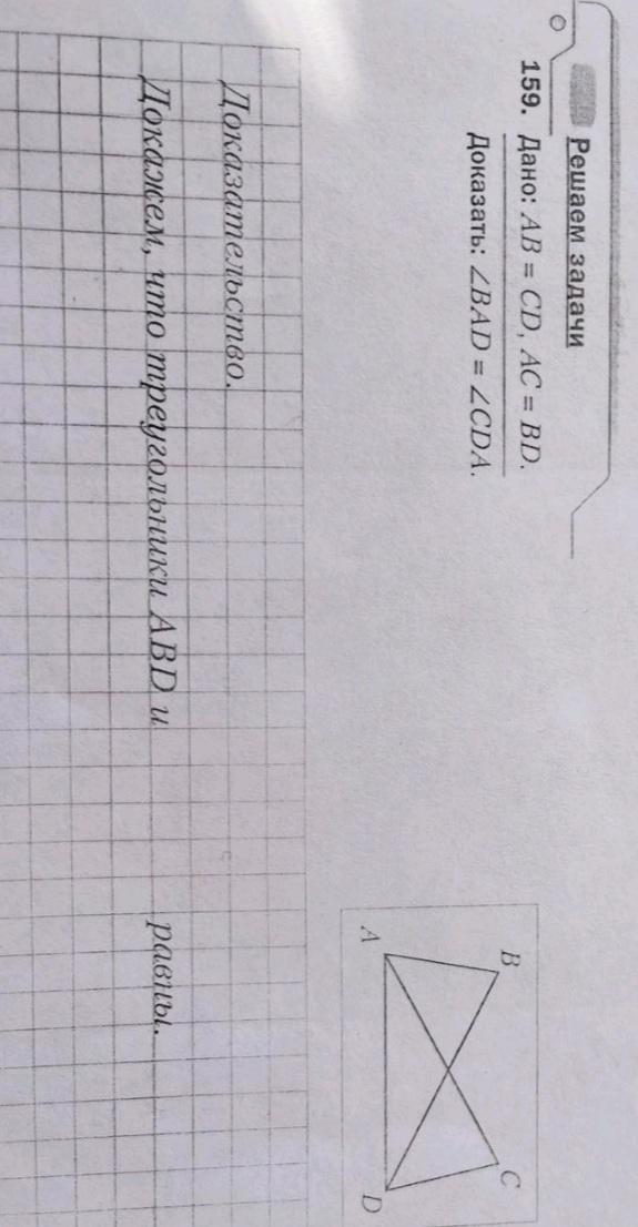 рассмотрим ΔАВД и ΔСАД, у них сторона АВ=СД, сторона АС=ВД и сторона АД- общая ⇒ эти тре-ки равны по третьему признаку равенства тре-ков по трем сторонам, значит и углы в этих тре-ках равны, т.е. ∠ВАД=∠СДА
