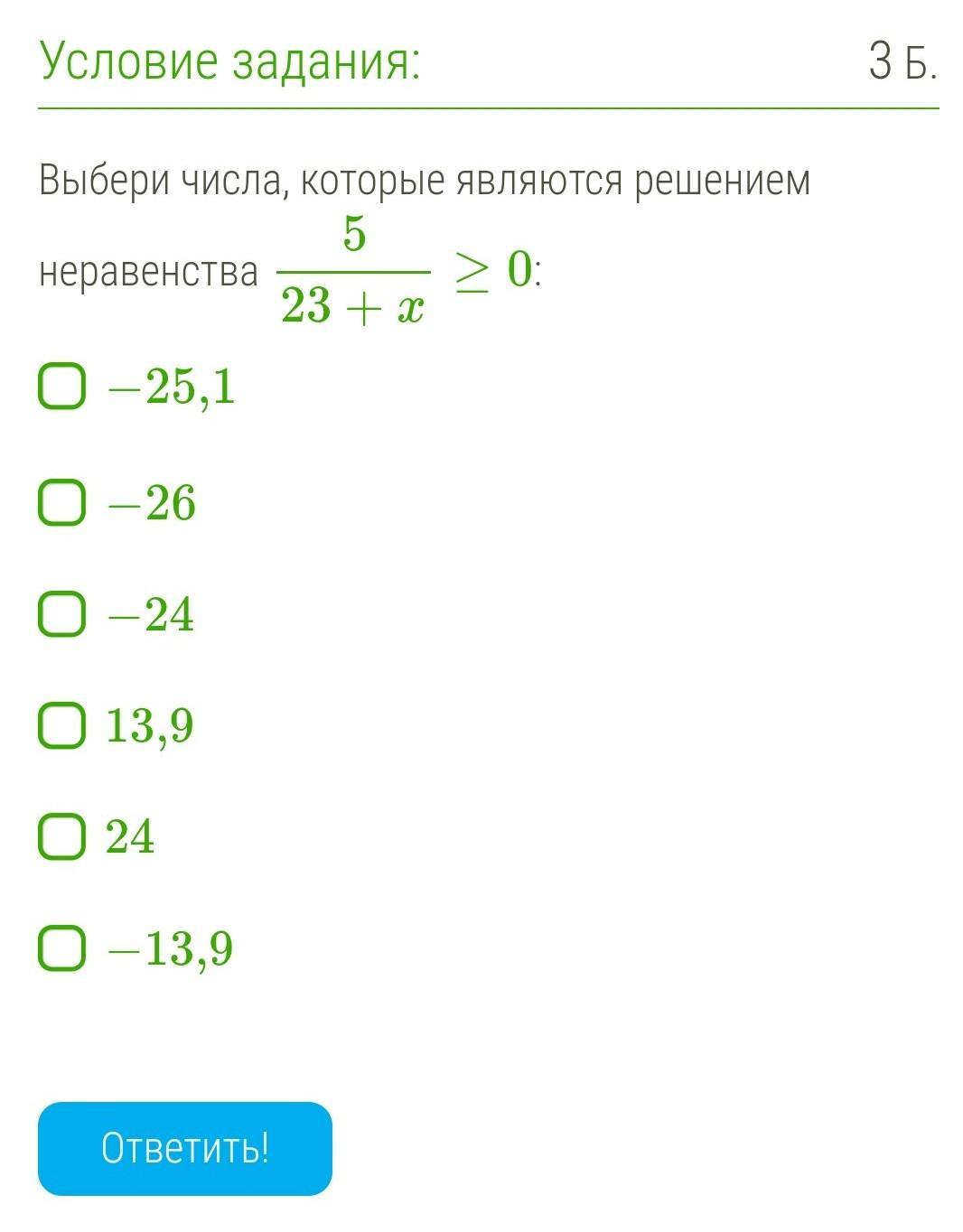 ОДЗ: х ≠ - 23. неравенство будет справедливо при (23+х) > 0, т.к. частное будет положительным числом,если делимое и делитель будут либо оба положительные, либо оба отрицательные,а число 5 - положительное