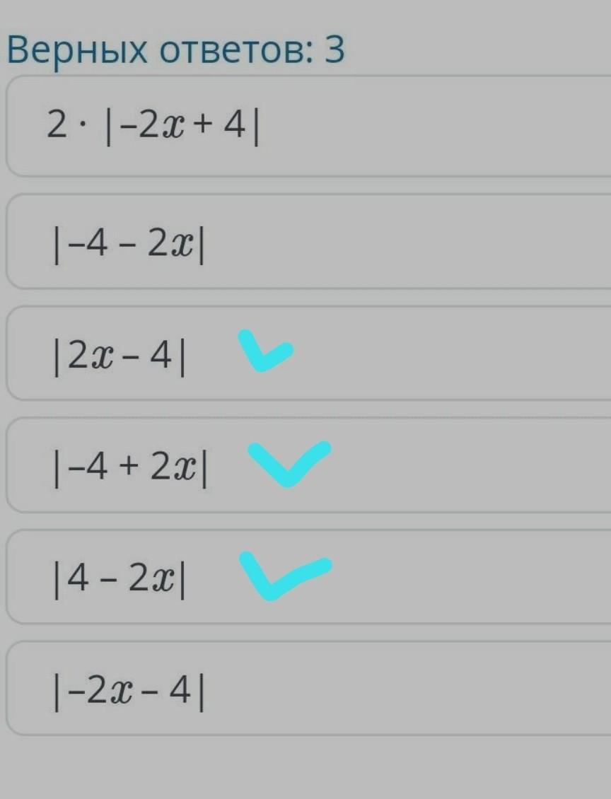 Тождественные преобразования выражений. Тождество. Урок 1 Верных ответов: 3 2 ∙ |–2x + 4| |–4 – 2x| |2x – 4| |–4 + 2x| |4 – 2x| |–2x – 4|