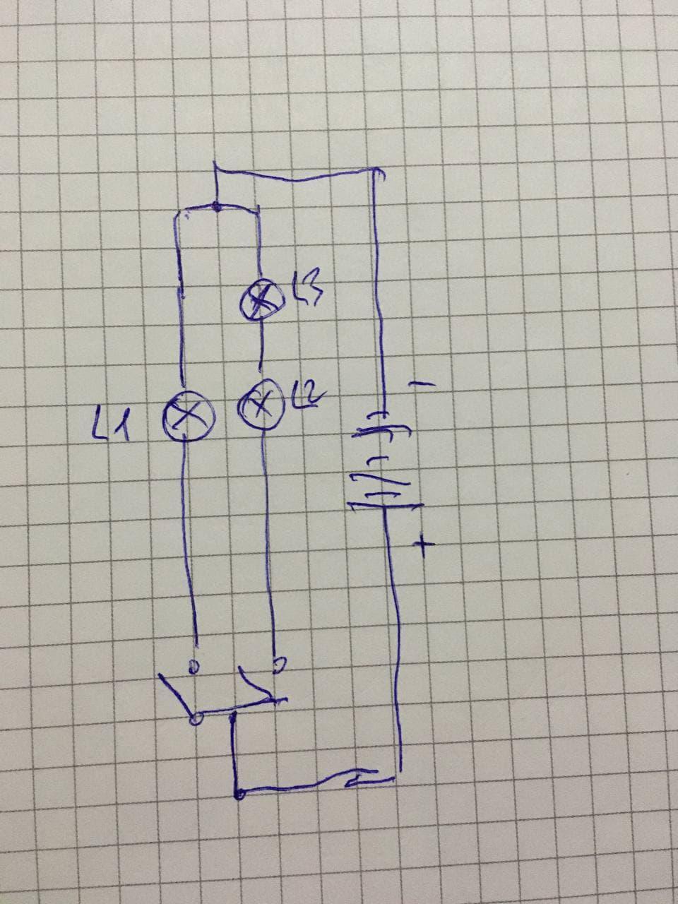 начертите схему электрической цепи позволяющей с помощью сдвоенного переключателя включать и выключать три лампы следующим образом: первый выключатель включает и выключает лампу 1, а второй - лампу 2 и 3. Выключатель должен быть соединен с тремя проводами