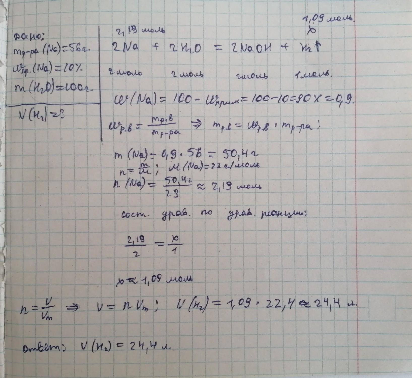 Определите объём водорода выделившегося при взаимодействии 50 г натрия содержащего 10% примесей со 100 г воды