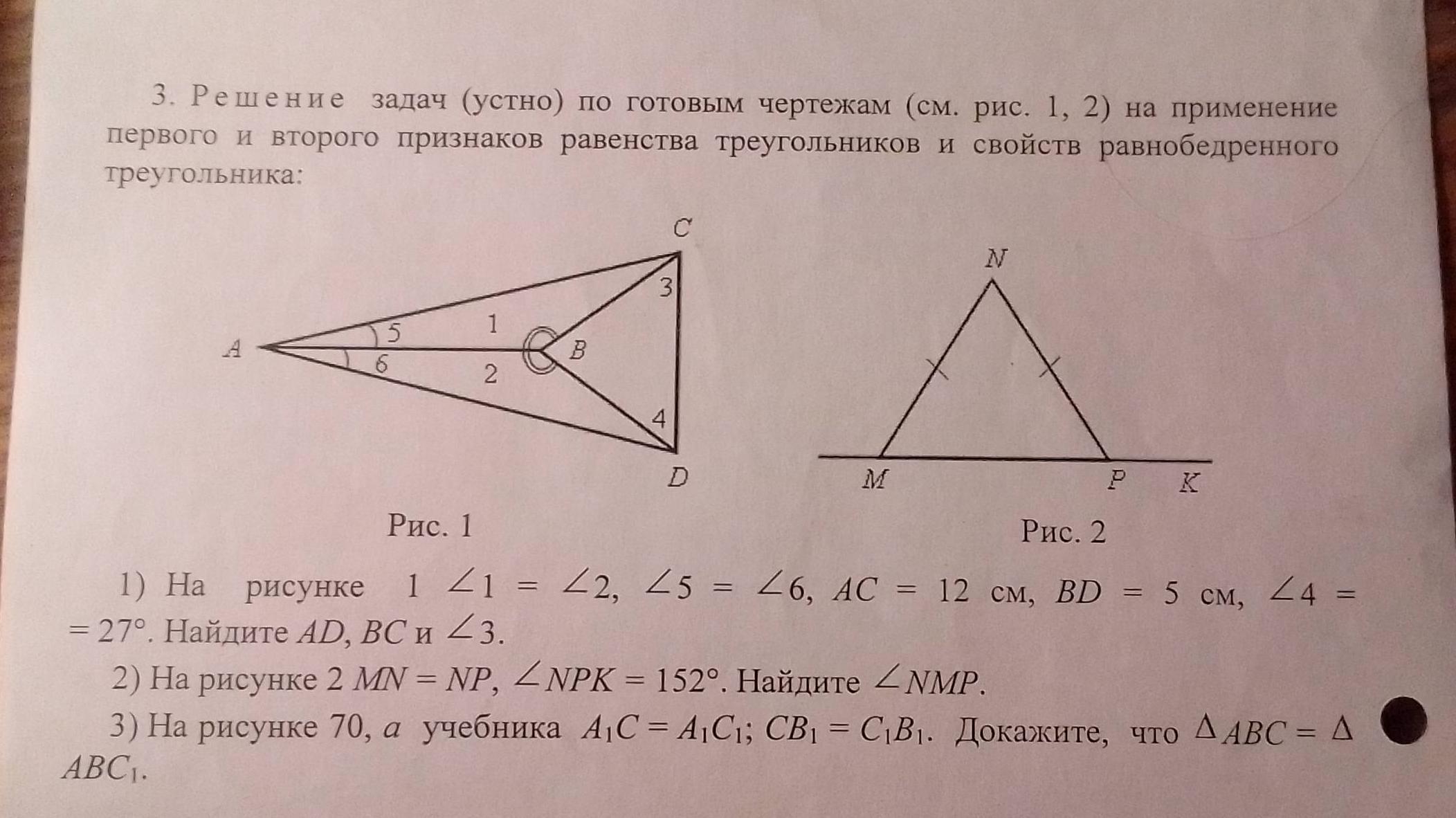 3 . 1) За ІІ ознакою рівності трикутників ΔАВС = ΔABD , бо ∠ 1 = ∠ 2 , ∠ 5 = ∠6;